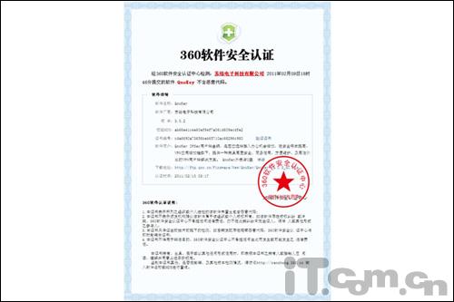 之前QnoKey軟件與 360安全衛士有沖突,用戶在安裝配套PC端軟件時經常被360報為惡意軟件,無奈之舉,只能請安裝 QnoKey 的用戶先卸除 360安全衛士,非常影響用戶的第一印象,對代理商也產生銷售上的困擾。現在QnoKey軟件已取得“360軟件安全認證”證書,不會再被報為惡意軟件,安裝QnoKey軟件時也不會再顯示要用戶卸除360軟件的信息。