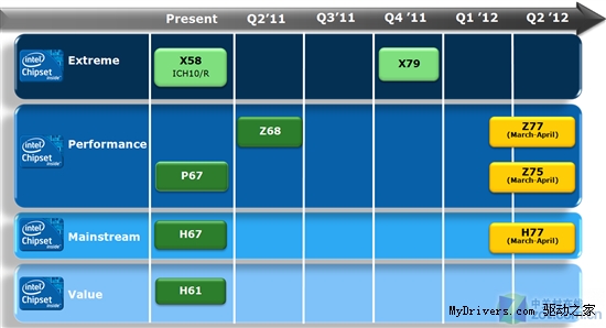 另一張芯片組路線圖也證明了新平臺的延遲。Z77、Z75、H77等三款與Ivy Bridge處理器配套的芯片組也都安排在3-4月份,分別取代Z68、P67、H67,但是入門級領域暫時繼續交給H61。