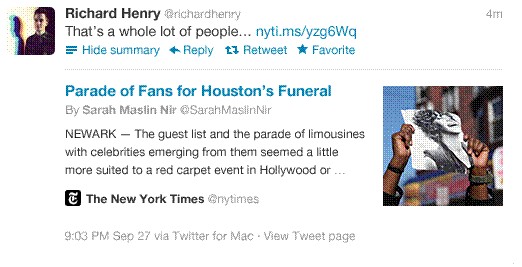 Twitter Cards實際上是一種為拓展后的、富媒體的Twitter消息提供支持的技術。在加入一些代碼行以后,出版商、品牌和開發者就能創造出更好的Twitter消息,在Twitter數據流內部展示其內容。舉例來說,當AllThingsD和《紐約時報》等網站通過Twitter消息來發布指向一篇報道的鏈接時,一張“摘要卡”就能顯示出一個更加精心設計的版本,就像是這樣:
