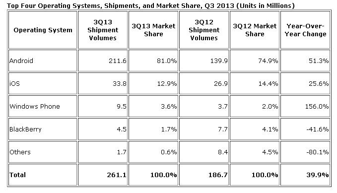 市場研究機構IDC周二發布的最新數據報告顯示,在今年第三季度,Android操作系統在智能手機市場領先優勢繼續擴大,份額首次突破80%;Windows手機增長迅速,該季度Windows手機出貨量同比增幅達到156%。