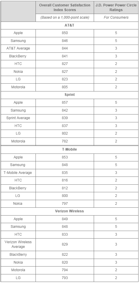在所有美國運營商智能手機設備整體滿意度中,最高的是AT&T用戶(844),其次是Sprint(839)、T-Mobile (835)和Verizon無線(829)。整體智能手機用戶的滿意度為837。