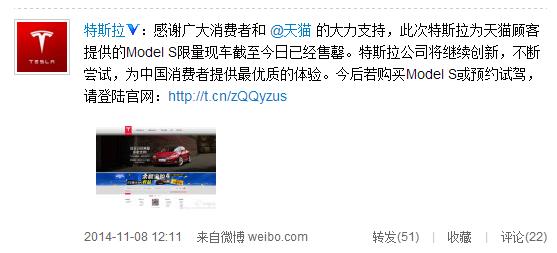 11月8日,特斯拉公司午間發(fā)布微博稱,特斯拉為天貓顧客提供的Model S限量現(xiàn)車截至已經(jīng)售罄,今后消費者若需購買Model S或預(yù)約試駕,需登錄特斯拉官方網(wǎng)站。目前,天貓?zhí)厮估炫灥暌殃P(guān)閉,所有車型信息均已下線,此前已交付定金的用戶,特斯拉會繼續(xù)為其服務(wù)直至整個服務(wù)完成。