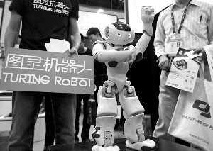 觀眾在觀看一款語音識別智能機(jī)器人。新華社發(fā)