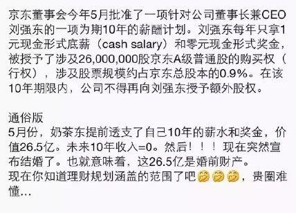 通俗點來說,5月份,劉強東提前透支了自己10年的薪水和獎金,價值26.5億,未來10年收入等于0,這也就意味著這26.5億是婚前財產。網友們紛紛表示同情:“那意思是章澤天離婚的話......結婚期間她自己掙的錢還要分給劉強東......心疼她。我決定好好學法了。”有網友則為奶茶妹妹打抱不平,稱“劉強東心機太重,這是赤裸裸的不信任,已經想不出兩人結婚的理由了。”
