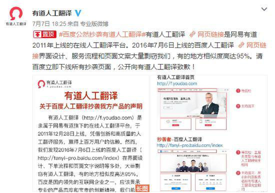 7月7日,有道人工翻譯官方微博發(fā)布長圖文,詳細(xì)列舉了6日上線的百度人工翻譯在界面設(shè)計、服務(wù)流程和頁面文案等方面剽竊有道人工翻譯,有些地方的相似度達(dá)到95%,并責(zé)令百度立即下線所有抄襲頁面,公開致歉。原微博已經(jīng)獲得3600多次轉(zhuǎn)發(fā),并引發(fā)不少主流媒體關(guān)注。