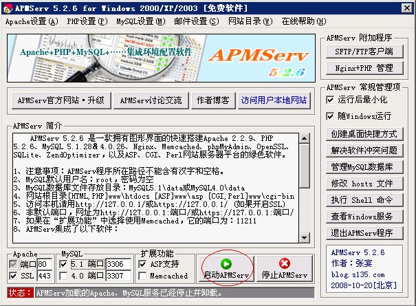 APMServ 5.2.6 是一款擁有圖形界面的快速搭建Apache 2.2.9、PHP 5.2.6、MySQL 5.1.28&4.0.26、Nginx 0.7.19、Memcached 1.2.4、phpMyAdmin 2.11.9.2、OpenSSL、SQLite、ZendOptimizer,以及ASP、CGI、Perl網站服務器平臺的綠色軟件。無需安裝,具有靈活的移動性,將其拷貝到其它目錄、分區或別的電腦時,均只需點擊APMServ.exe中的啟動按鈕,即可自動進行相關設置,將Apache和MySQL安裝為系統服務并啟動。APMServ集合了Apache穩定安全的優點,并擁有跟IIS一樣便捷的圖形管理界面,同時支持MySQL 5.0 & 4.0兩個版本,虛擬主機、虛擬目錄、端口更改、SMTP、上傳大小限制、自動全局變量、SSL證書制作、緩存性能優化等設置,只需鼠標一點即可完成。