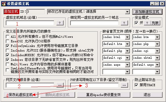 保存好虛擬主機后,要點擊“重啟Apache使設置生效”,新的站點才會生效。