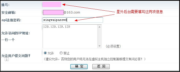 2、點擊左側的“代理商管理”——“API接口配置”,設置好您的接口用戶名和密碼,允許訪問的IP地址填寫您的星外系統主控服務器的IP.如圖: