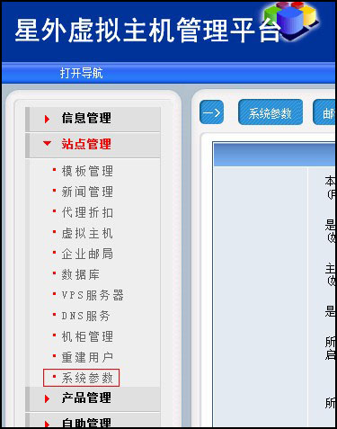 登陸后,點擊“站點管理”——“系統參數”,如圖: