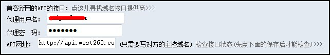 這里要求輸入代理用戶名、代理密碼以及API網址。代理用戶名和密碼參見說明文檔開頭設置的密碼。API網址填寫:http://api.west263.com。如圖: