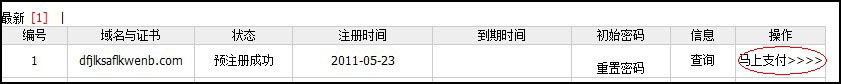 系統會提示“預注冊成功,馬上付費>>>”,點擊后系統會轉到域名管理列表,您剛注冊的域名會提示“預注冊成功”,點擊最右側的“馬上支付>>>>” 就正式注冊成功了,如圖: