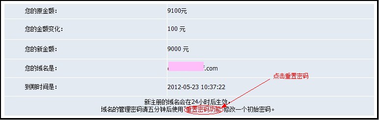系統會提示您的域名到期時間和重置密碼的提示:新注冊的域名會在24小時后生效,域名的管理密碼請五分鐘后使用"重置密碼功能"修改一個初始密碼。點擊“重置密碼功能”,如圖: